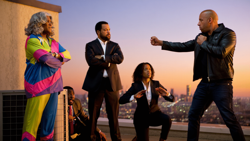 And then there’s Vin Diesel. Yes, that Vin Diesel. As Marcus “Steel” Daniels, a quiet ex-street racer turned neighborhood protector, Diesel brings gravitas and unexpected warmth. His scenes with Madea are a highlight — especially when he tries to deliver one of his signature gravelly “family” speeches, only for Madea to interrupt with, “Boy, don’t talk to me about family unless you’ve been to five reunions, three divorces, and one church fish fry!” It’s the perfect collision of worlds — Fast & Furious meets Madea’s Family Reunion — and it’s glorious.