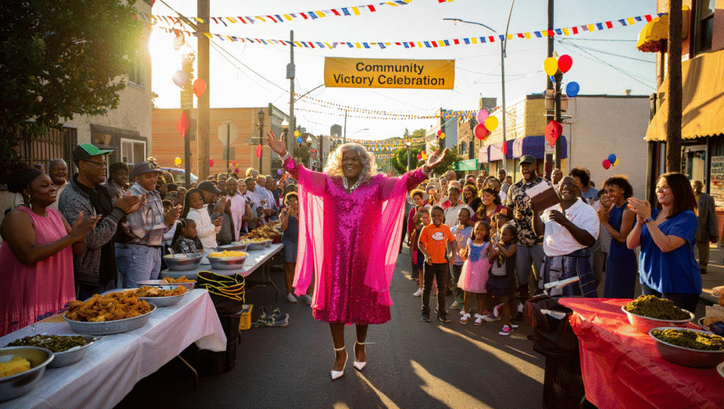 By the third act, the film goes full-throttle: a block-wide uprising where neighbors, families, and old rivals unite under Madea’s unconventional leadership. There are drones, spray-painted slogans, and even a food-truck barricade — all orchestrated by Madea with the precision of a general and the humor of a stand-up queen. When she finally declares, “Ain’t no bulldozer strong enough to tear down spirit, baby!” it lands like a gospel shout in a comedy riot.