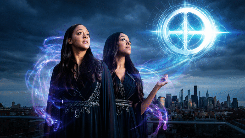 The story begins not in the realm of Coventry, but in the world of the ordinary — where extraordinary lives are quietly hiding. Alex and Camryn, played once more by Tia and Tamera Mowry with the grace of women who have lived, not just acted, are now leading separate but intertwined lives among mortals. Their powers have long been sealed, their connection unspoken, yet their bond remains palpable — an invisible current that hums even in stillness. Then, during a rare lunar eclipse, an otherworldly sigil blazes across the night sky — seen only by them. It’s a summons from the past, one that reignites a destiny neither could escape.