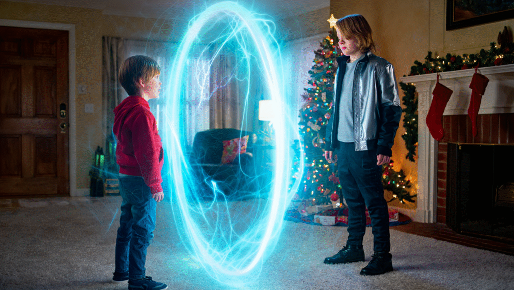 Then — through a portal shimmering in the air like a Christmas ornament on fire — comes the twist that transforms the film: Macaulay Culkin returns as Future Kevin, older, wiser, and scarred by years of surviving both time and loneliness. Culkin’s reappearance is pure cinematic joy. He doesn’t play it for laughs — he plays it for legacy. His Kevin is a man haunted by what he once was, and Tremblay’s Kevin is the reminder of everything he still can be. Together, they form one of the most unexpectedly emotional duos of the year.