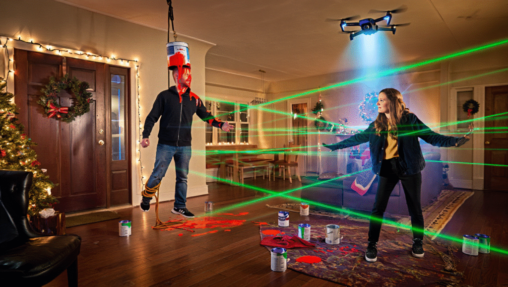Visually, the film is a treat. From the neon glow of the time portal reflecting off snowdrifts to the chaotic beauty of booby-trapped hallways shimmering with holographic ornaments, Time Trap feels like a Christmas card from the future. Every frame bursts with color, light, and playfulness, yet the cinematography never loses sight of the cozy intimacy that made the original Home Alone unforgettable.