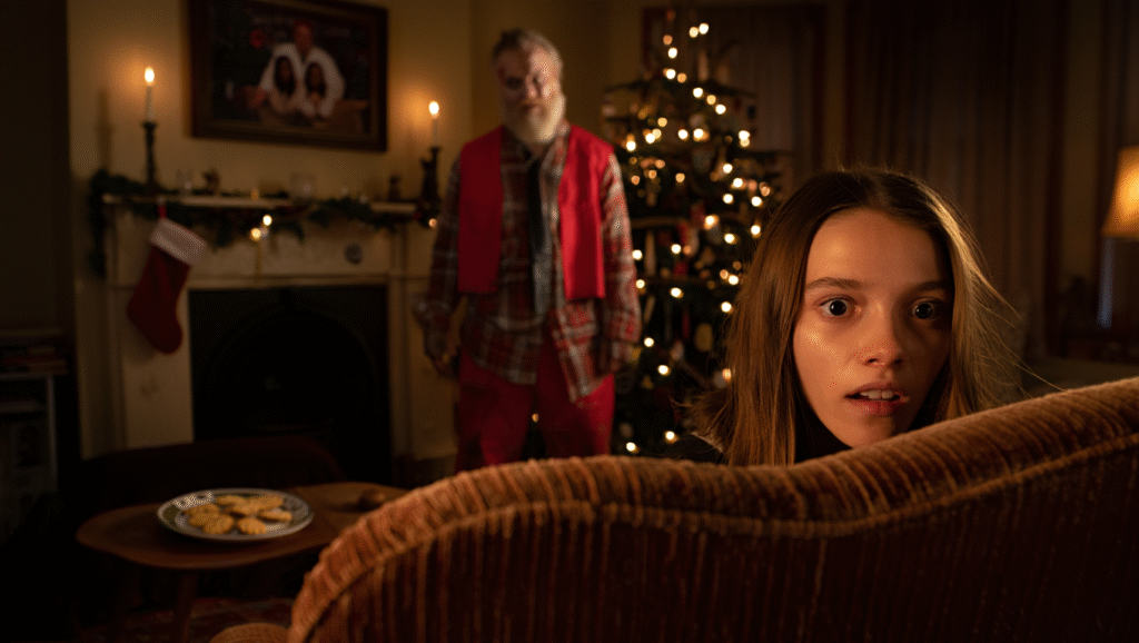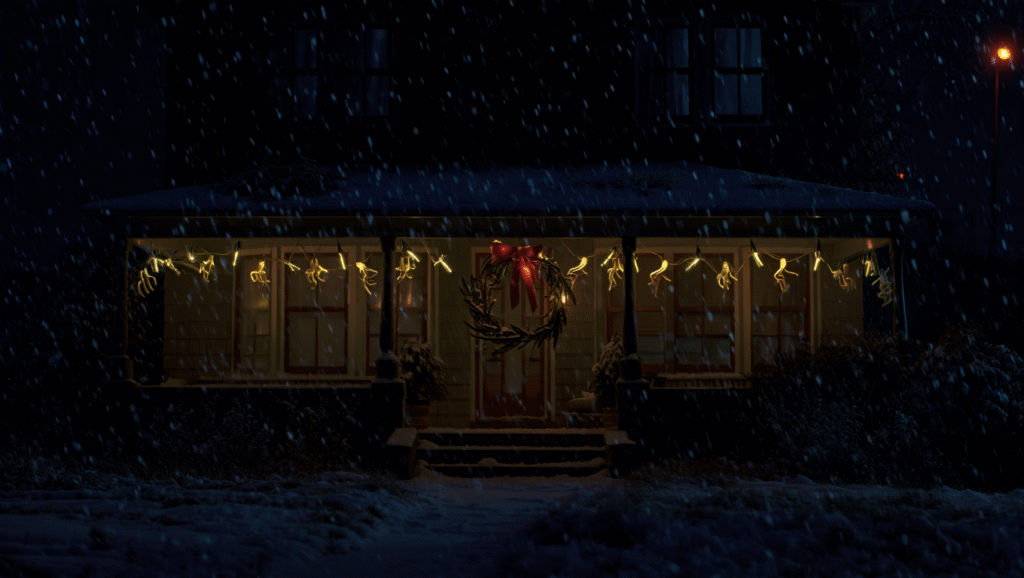 Director Mike P. Nelson doesn’t play this as a slasher for nostalgia’s sake. Instead, he crafts a film steeped in dread and melancholy, where every snowflake feels like ash falling from a fire long extinguished. The cinematography by Eli Born captures a chilling duality — the glow of Christmas lights reflecting off pools of blood, the warmth of family gatherings shadowed by the lurking figure in red. It’s Black Christmas meets The Joker — a story where horror is born from empathy, not just shock.