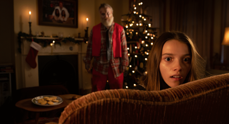 Director Mike P. Nelson doesn’t play this as a slasher for nostalgia’s sake. Instead, he crafts a film steeped in dread and melancholy, where every snowflake feels like ash falling from a fire long extinguished. The cinematography by Eli Born captures a chilling duality — the glow of Christmas lights reflecting off pools of blood, the warmth of family gatherings shadowed by the lurking figure in red. It’s Black Christmas meets The Joker — a story where horror is born from empathy, not just shock.