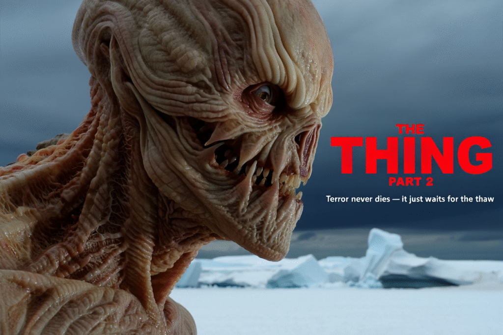 In a bold narrative twist, The Thing: Part 2 isn’t about rediscovering the monster — it’s about understanding what’s left of humanity after it. Survivors of past expeditions resurface, their bloodlines and memories twisted by decades of cover-ups. Scientists begin to question not only who’s infected, but whether the organism has already integrated into human society far beyond the ice. It’s a terrifying escalation of Carpenter’s paranoia: what if The Thing has been among us for years — adapting, evolving, learning?