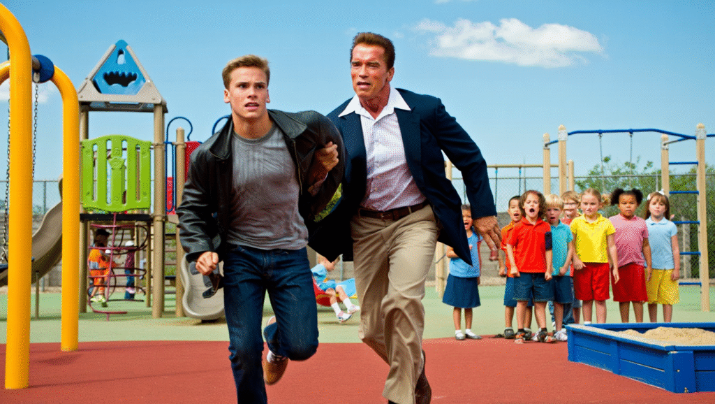 Of course, Schwarzenegger hasn’t lost his taste for action. The third act delivers a thrilling showdown that blends slapstick with spectacle. Imagine a criminal chase that winds through a school carnival, complete with exploding cotton candy machines and kids cheering as Kimble takes down the bad guy. It’s both absurd and exhilarating—a balance only a film like this could achieve.