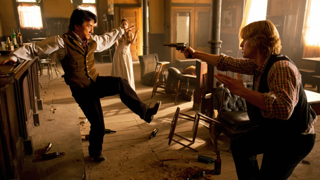 Comedy, of course, is where Shanghai Noon 3 shines brightest. Wilson’s deadpan delivery collides hilariously with Chan’s physical humor, producing moments that feel improvised, chaotic, and wholly genuine. Whether it’s Roy mangling cultural customs or Chon trying (and failing) to keep things dignified, the laughs flow naturally from character rather than forced punchlines.