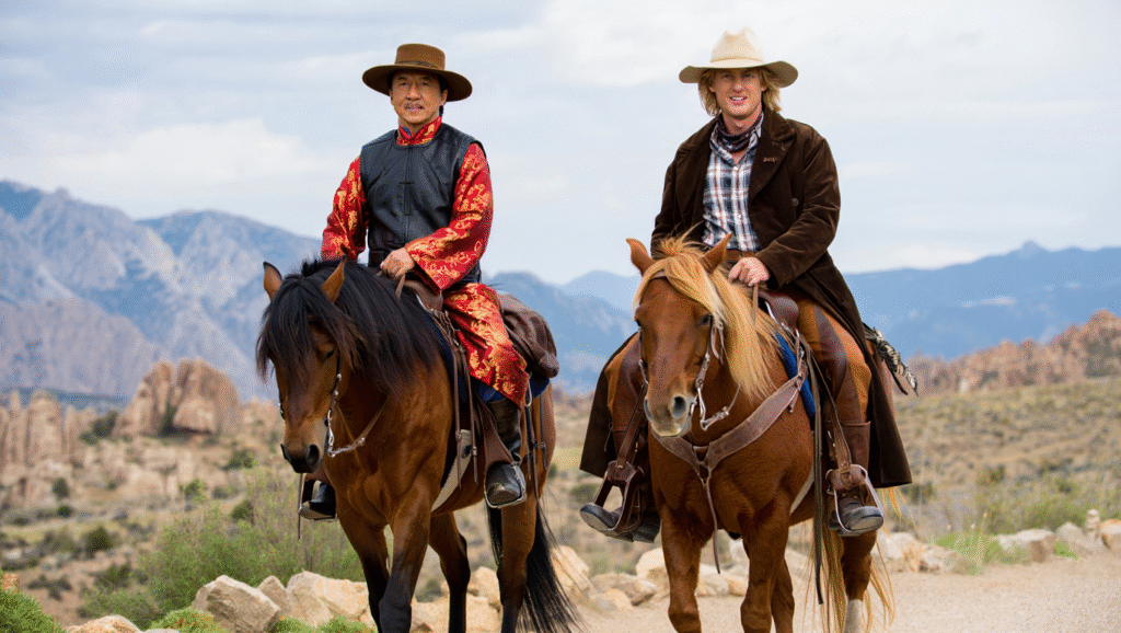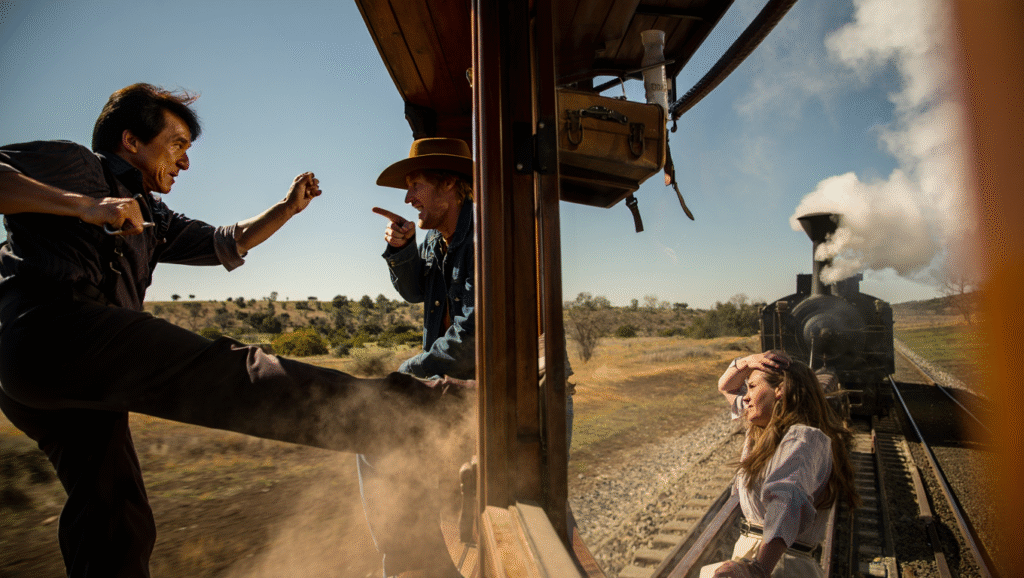 The film’s setup wastes no time: Chon Wang (Chan), now a weary but ever-honorable hero, finds himself pulled back into Roy O’Bannon’s (Wilson) schemes—this time on a scale neither could have imagined. Their journey moves beyond dusty saloons and train robberies, expanding into international intrigue that spans deserts, city skylines, and even rooftops where Chan can once again defy gravity with his signature stunts.