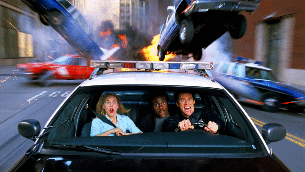 Action sequences play a bigger role this time around, with elaborate stunts that showcase Carrey’s physicality. A chaotic highway chase where Charlie literally fights Hank for control of the steering wheel (complete with seatbelt gymnastics) is destined to become a highlight reel moment. The Farrellys understand Carrey’s body is his greatest special effect, and they frame every gag around his ability to contort, stumble, and explode with energy.