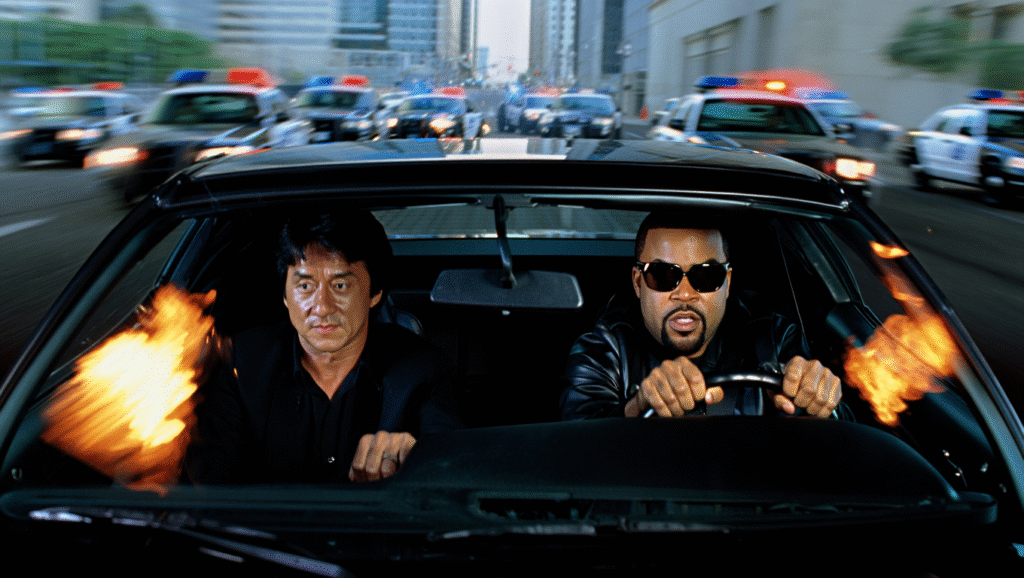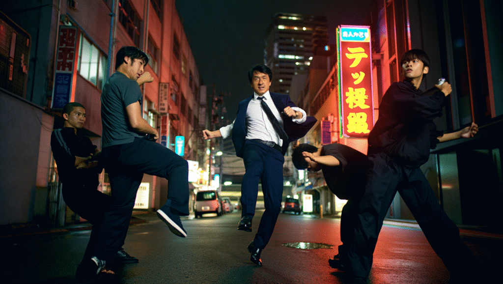 The story moves at breakneck speed, hopping from neon-soaked Tokyo back alleys to sun-drenched Los Angeles freeways. Director Stanley Tong, a longtime Chan collaborator, keeps the action playful and visually dynamic, layering in car chases, rooftop pursuits, and elaborate fight choreography that showcases both Chan’s creativity and Hollywood’s scale.