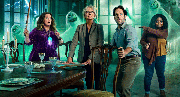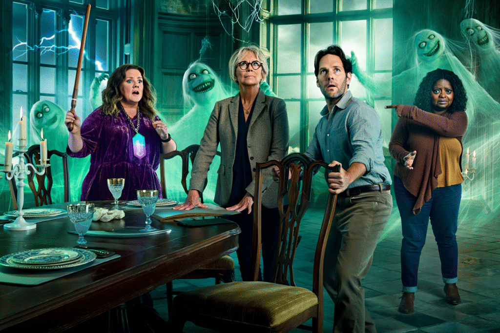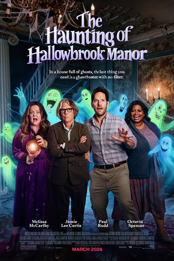 The Haunting of Hallowbrook Manor (2026) fully embraces the joyful absurdity of supernatural comedy, leaning hard into both spooky atmosphere and laugh-out-loud character work. With Melissa McCarthy, Jamie Lee Curtis, Paul Rudd, and Octavia Spencer sharing the screen, the film knows exactly what kind of ride it’s offering: a haunted house where fear takes a backseat to personality clashes, sharp timing, and ghosts who are frankly bored with eternity.