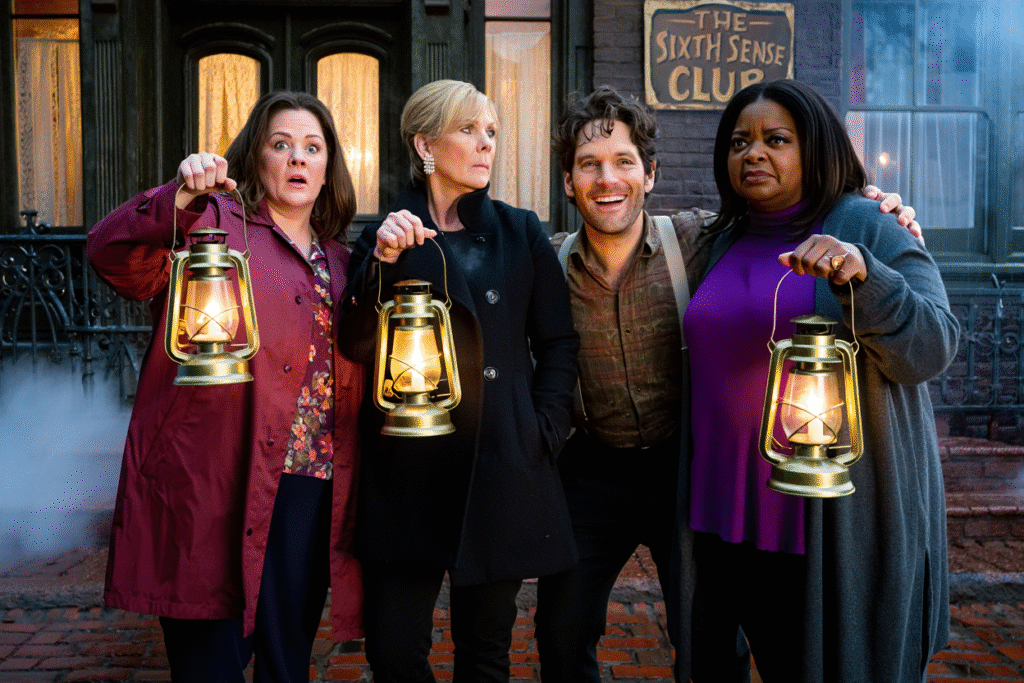 Melissa McCarthy anchors the film as Lily, an everywoman whose ability to see ghosts feels less like a gift and more like a lifelong inconvenience. McCarthy plays her not as a caricature, but as someone exhausted by the extraordinary. Her comedy is grounded, human, and deeply relatable, making Lily the perfect emotional entry point into this unusual club.