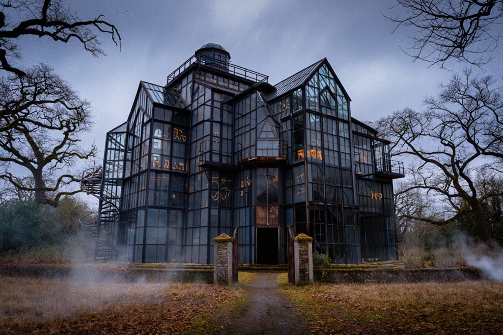The mansion itself becomes the film’s most fascinating character. Built from enormous panels of etched glass covered in arcane symbols, the structure feels both beautiful and deeply unnatural. The transparent walls reveal glimpses of movement where nothing should exist, creating a sense that the house is always watching its occupants.