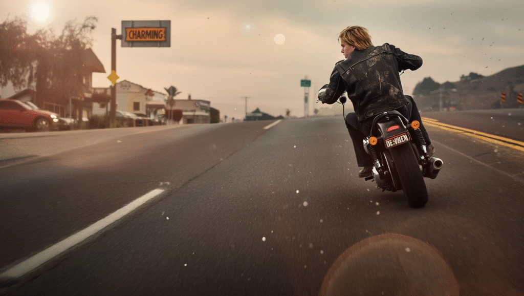 The cinematography captures this shift—blending dusty highways and industrial landscapes with a cold, modern edge.