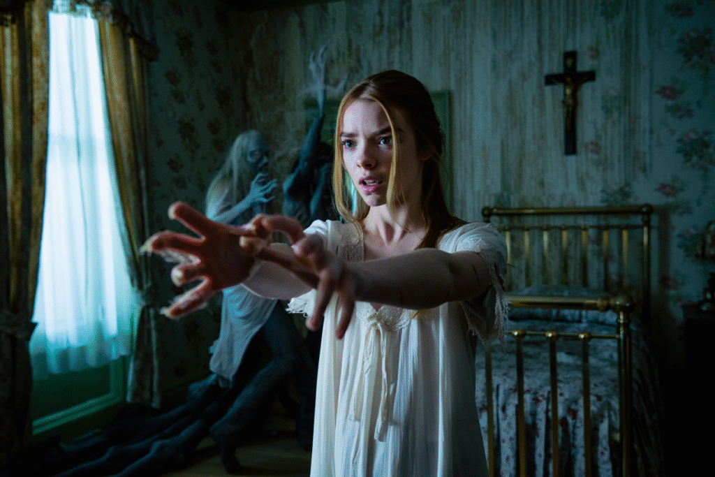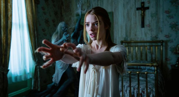 Anya Taylor-Joy is the film’s emotional center as the troubled daughter whose bond with the house becomes increasingly intimate. She excels at portraying characters balanced between fragility and danger, making her perfect for a role in which victimhood slowly blurs into something more complicated. Her visions of past victims become some of the film’s most haunting sequences.