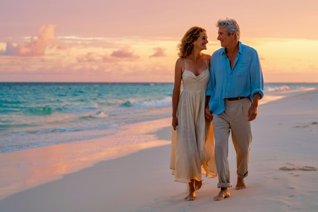 Visually, warm coastlines, sunset dinners, moonlit conversations, and ocean horizons provide the softness such a mature romance needs. But beauty alone should contrast with discomfort — paradise cannot protect people from truths they bring with them.