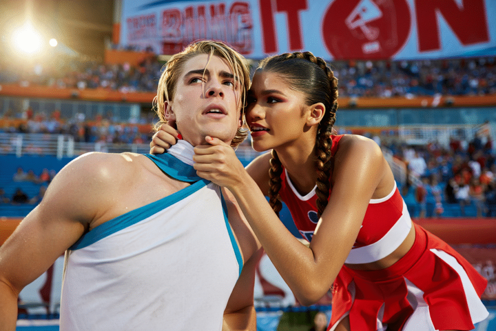 Opposite her, Jacob Elordi brings easy charisma as the rival competitor who approaches cheer not as obligation, but joy. He moves through the story with a looseness that challenges everything she believes success requires. Their chemistry works because it is built on contrast—control meeting spontaneity, discipline meeting freedom.