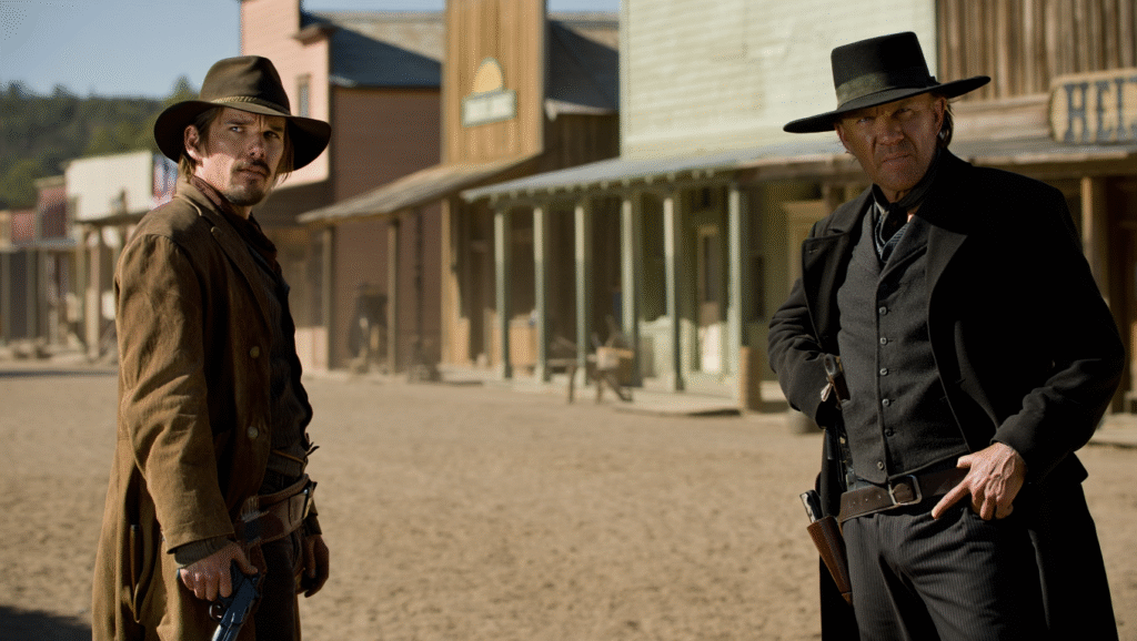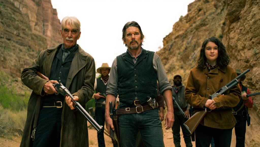 At the heart of this continuation is Ethan Hawke as James McCandles, grandson of the original Big Jake. Hawke plays him not as a swaggering gunslinger, but as a weary rancher trying to carve a life of stability in a world that refuses to let violence stay buried. His performance blends quiet restraint with flashes of rage, embodying the struggle of a man who inherits a family name heavy with both honor and blood.