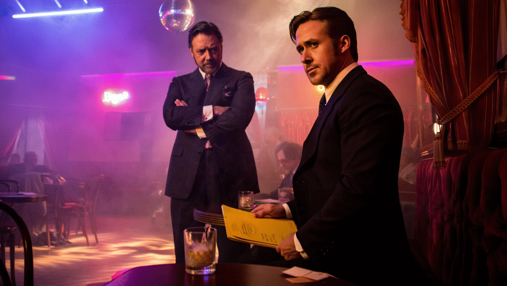 Tonally, the film doubles down on the blend of noir grit and slapstick comedy that made the first one so distinctive. Neon-lit bars, smoky backrooms, and corrupt boardrooms provide the backdrop, but the mood is constantly undercut by March’s haplessness and Healy’s exasperation. It’s a love letter to pulp detective stories wrapped in comedy’s warm embrace.