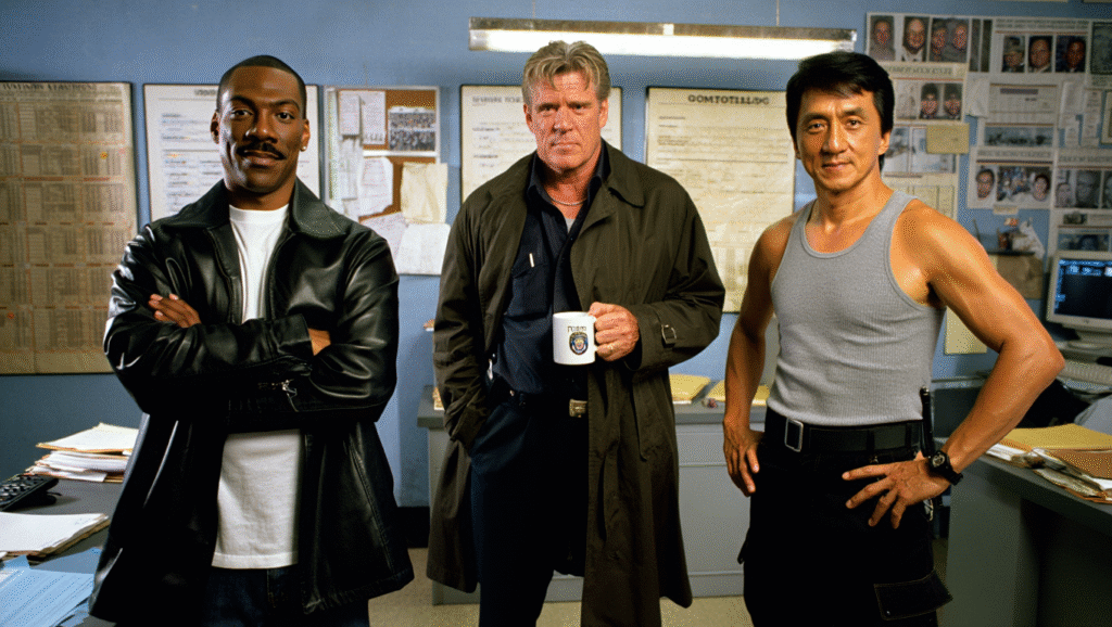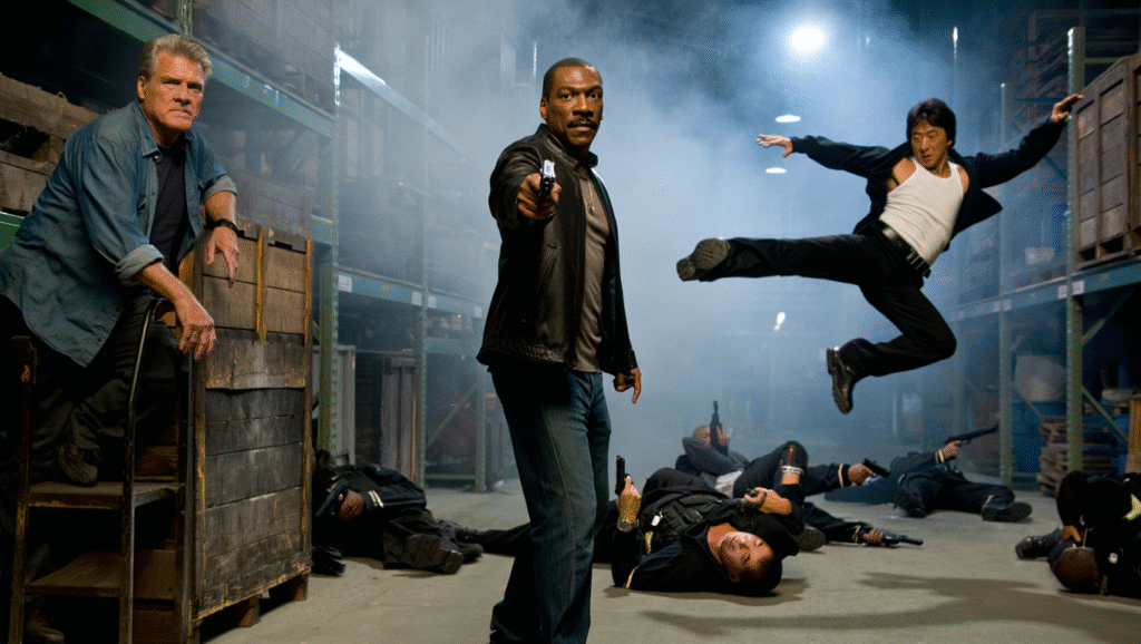 Then comes the curveball: Jackie Chan as Li Wei, an off-the-grid operative with a mysterious past and a code all his own. Chan’s arrival injects the film with kinetic energy, his trademark physical comedy and stunt choreography elevating the action to new heights. Watching Chan’s graceful combat collide with Murphy’s street smarts and Nolte’s brute-force policing is pure cinematic joy. The trio’s culture clash becomes the movie’s engine — every scene buzzing with humor, chaos, and unexpected camaraderie.