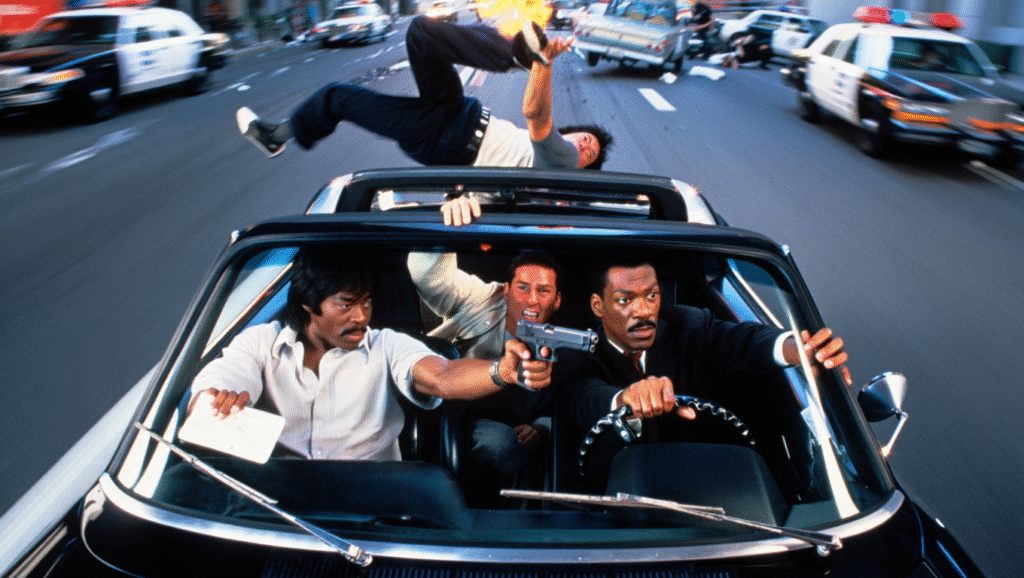 Action-wise, 48 Hours 2 is a masterclass in practical filmmaking. The stunts are raw and tactile — Chan performs jaw-dropping sequences that blend martial artistry with urban realism, while Murphy and Nolte’s rough-and-tumble brawls keep things grounded. A standout sequence atop a Los Angeles skyscraper showcases all three leads working in chaotic unison — it’s equal parts thrilling and hysterical, encapsulating the movie’s unique rhythm.