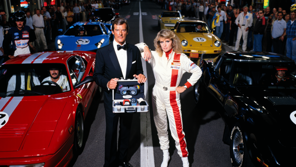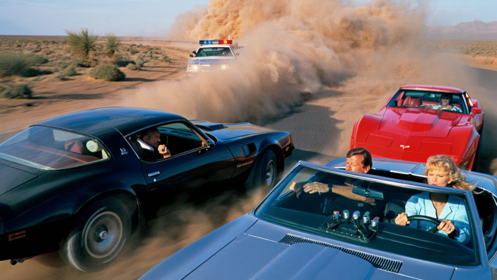 The film itself is a carnival on wheels — a mad symphony of screeching tires, airborne vehicles, and outrageous sight gags. Director Hal Needham, a stunt legend in his own right, ensures that every sequence feels practical and dangerous in the best way. There’s a tangible joy in the chaos — real cars, real crashes, real laughter. No CGI explosions here; just the raw thrill of seeing machines and maniacs defy physics for fun.